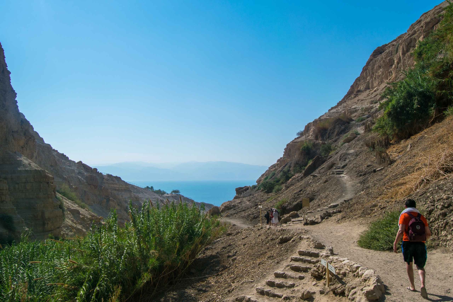 Ensuite, continuez vers le véritable point fort de l'excursion, une visite à travers l'étonnante réserve naturelle d'Ein Gedi avec ses sources naturelles, ses cascades et ses étonnantes plantes et faune du désert. Après cette longue marche, vous serez prêt à reposer vos pieds fatigués et à flotter sans effort dans les eaux curatives de la mer Morte ou à prendre un bain dans la boue thérapeutique à l'endroit le plus bas de la planète : Une expérience vraiment unique qui vous laissera détendu et fortifié.